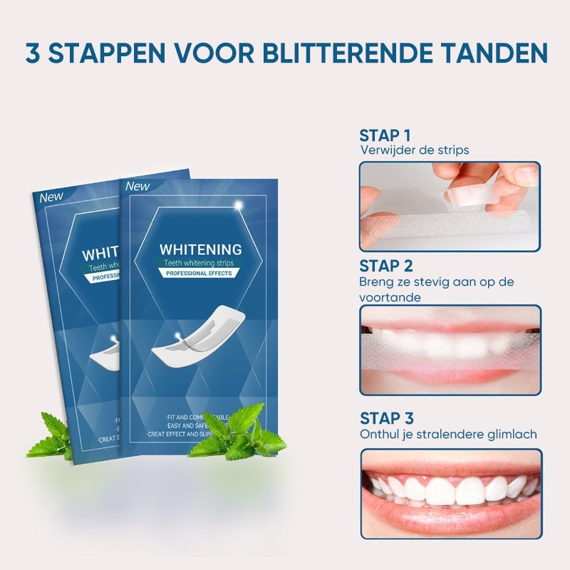 Onze tandenbleekstrips bieden een veilige en effectieve manier om een stralendere, wittere glimlach te krijgen zonder peroxide of tandgevoeligheid. Dankzij een geavanceerde whiteningformule verwijderen deze strips voorzichtig vlekken en verkleuringen van je tanden, waardoor een stralendere, natuurlijke tint ontstaat.