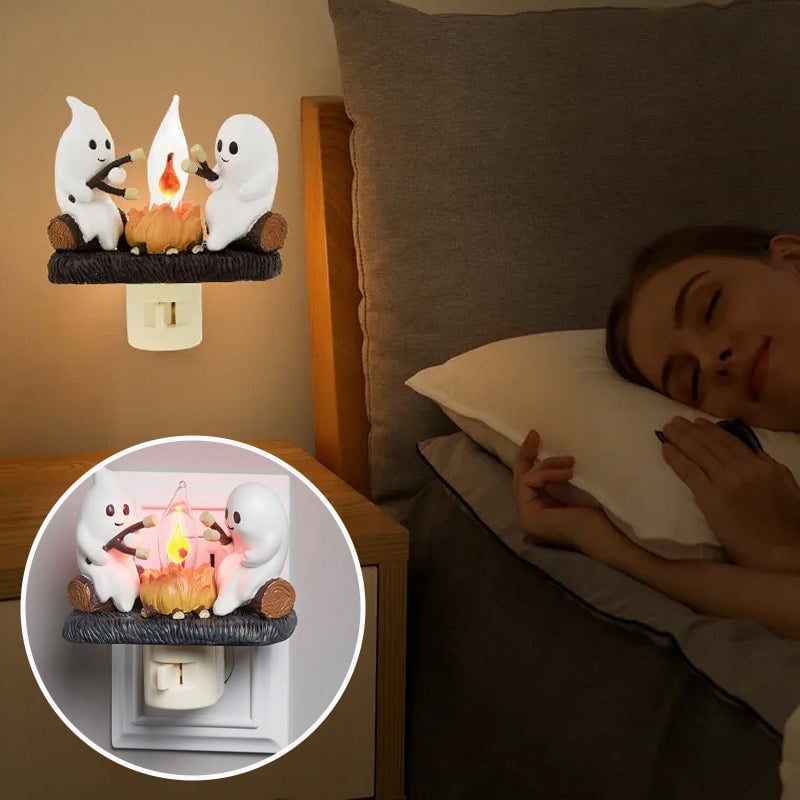 Schattig spookontwerp 👻: een vriendelijke geest die geniet van een kampvuur en een charmante en speelse sfeer in uw interieur brengt.