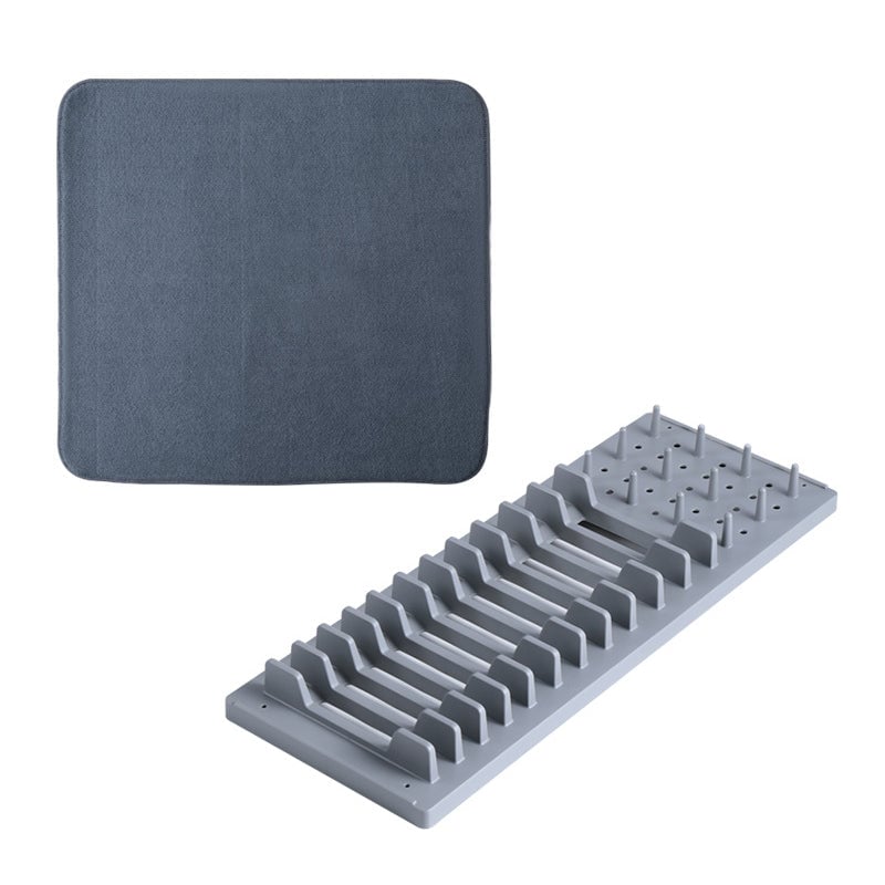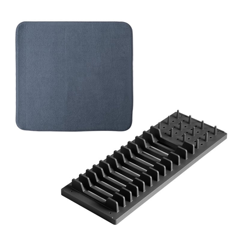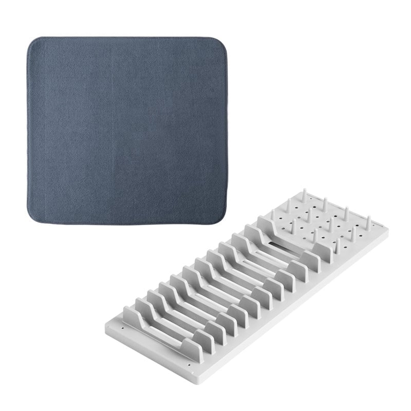 Geniet van het gemak van een microvezel droogmat gecombineerd met een verwijderbaar BPA-vrij plastic afdruiprek. De mat absorbeert waterdruppels efficiënt, terwijl het afdruiprek de vaat hoog houdt voor een optimale luchtcirculatie.
